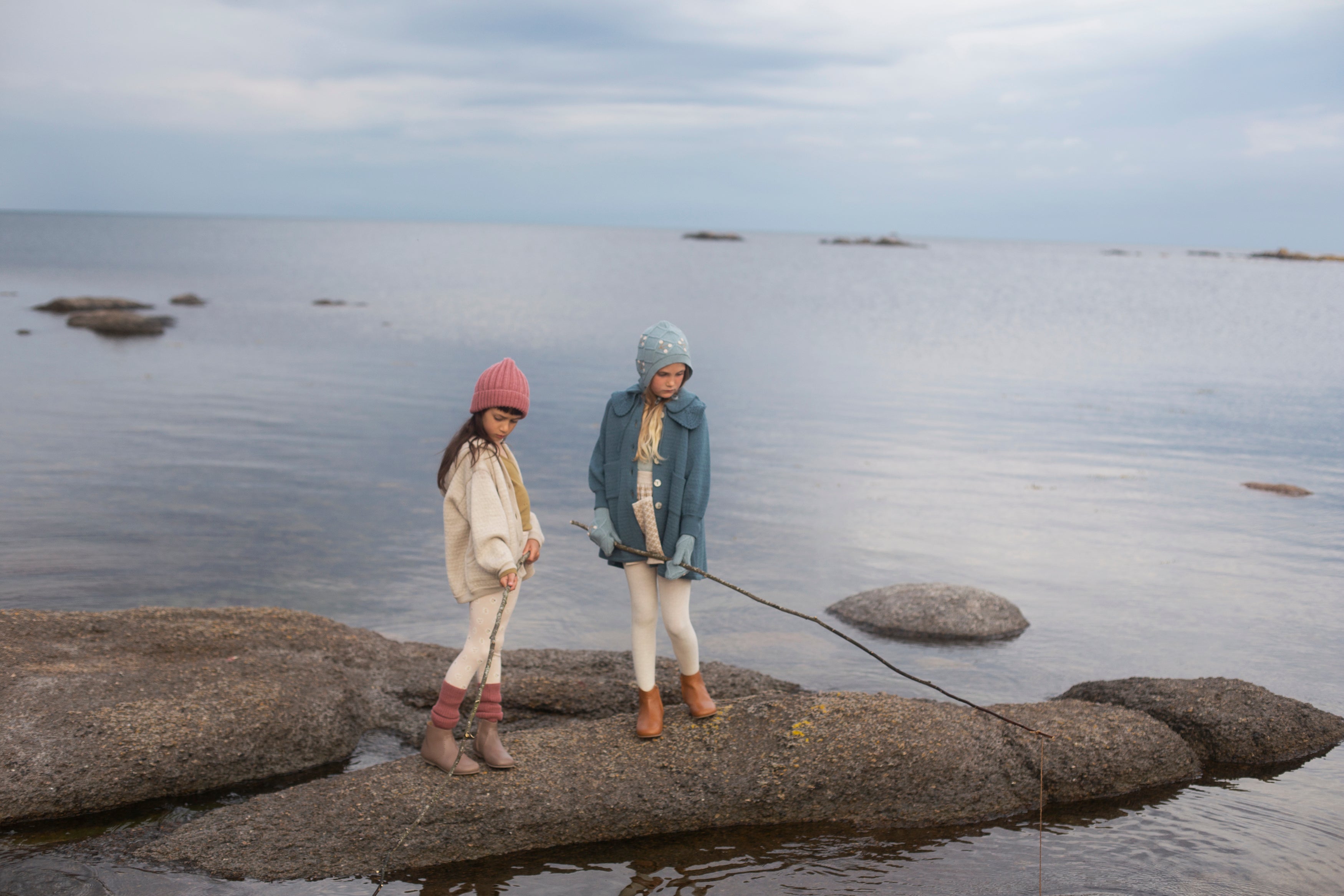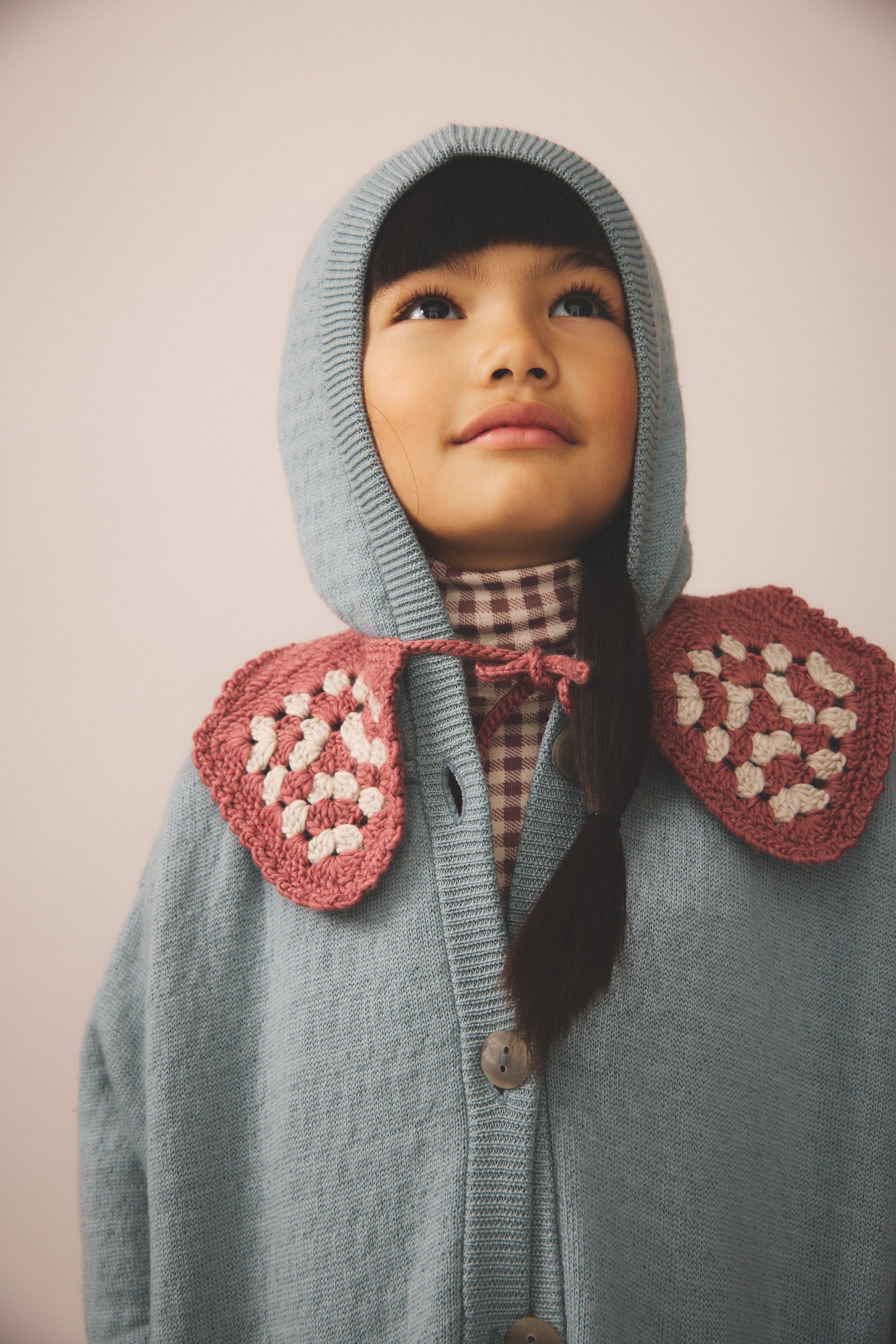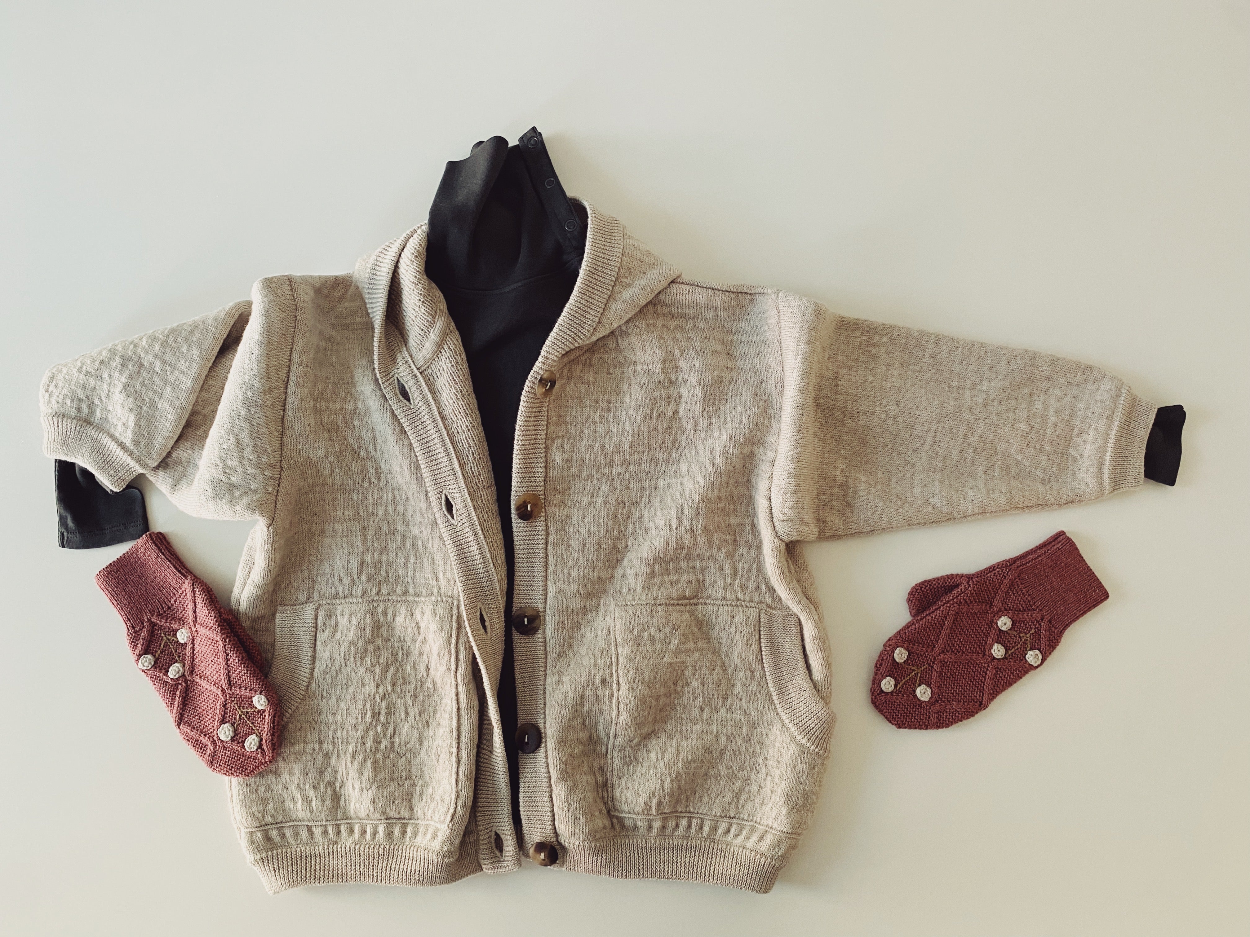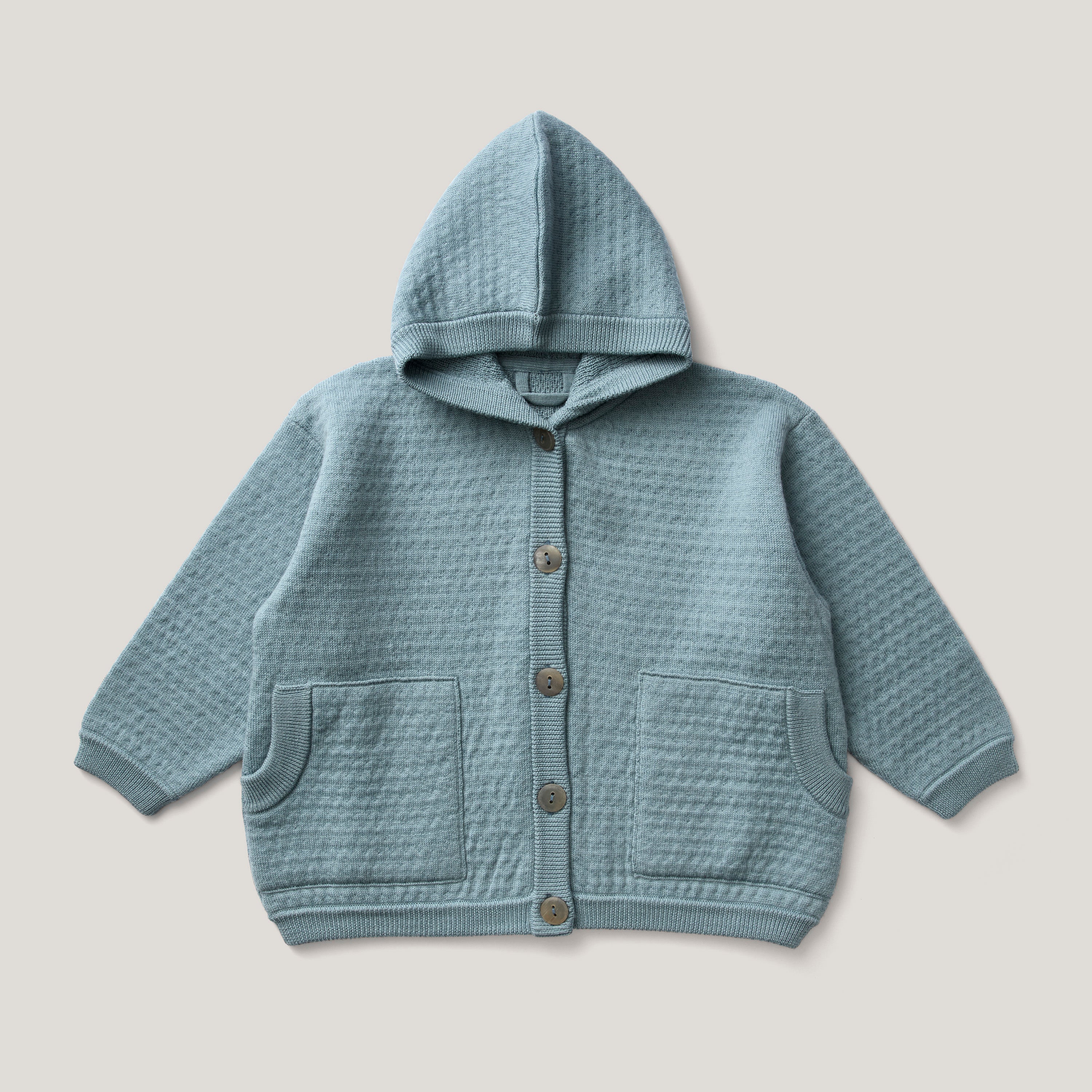 Cozy hooded sweater coat in our thick two ply blanket stitch. Roomy fit for easy layering over your favorite sweater. Natural horn buttons and rib trimmed pockets.
