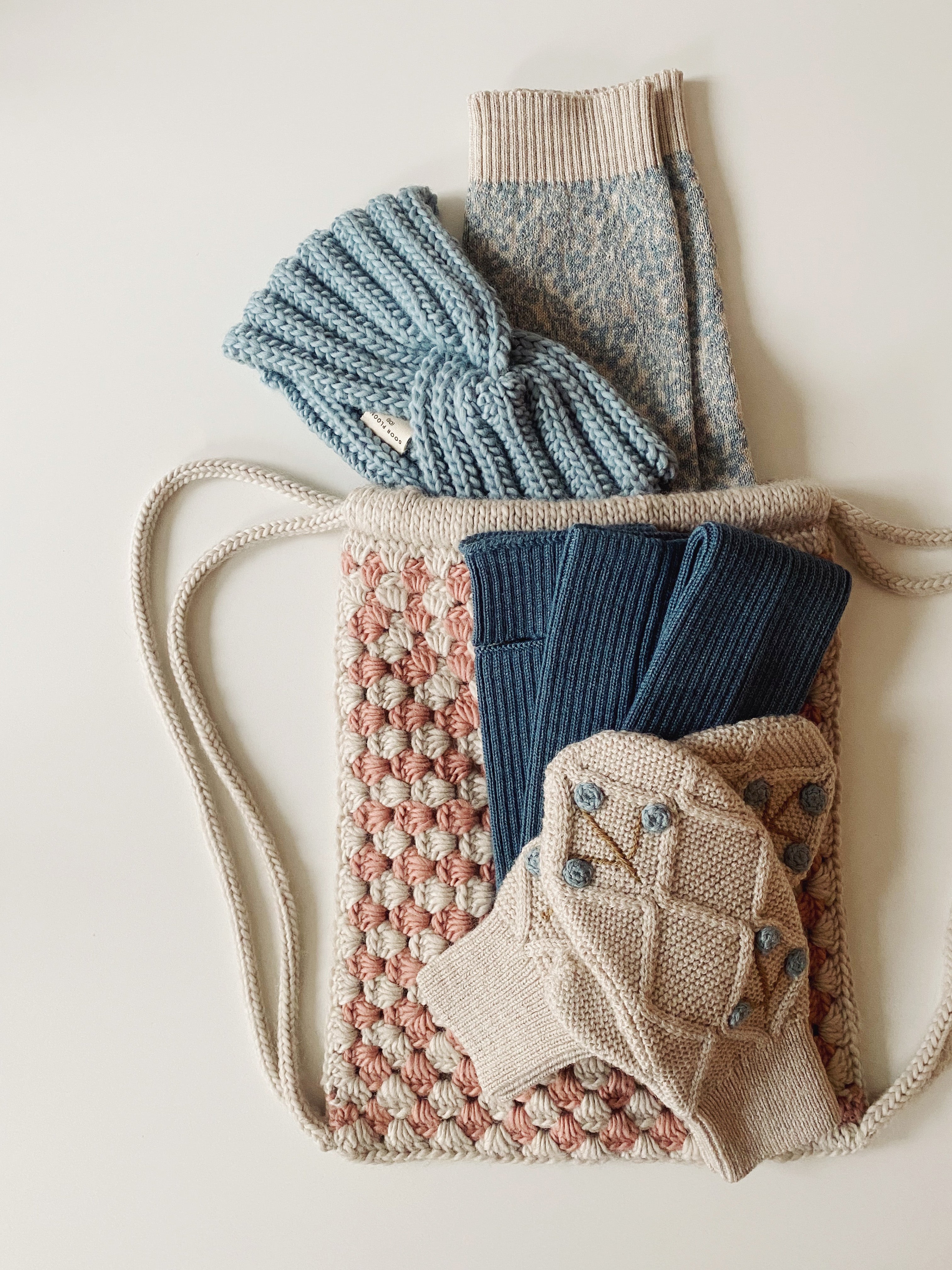 Hand crochet granny squares string sack lined with organic pima cotton rib.*This style is exclusive to our website.*100% Merino WoolMade in Peru