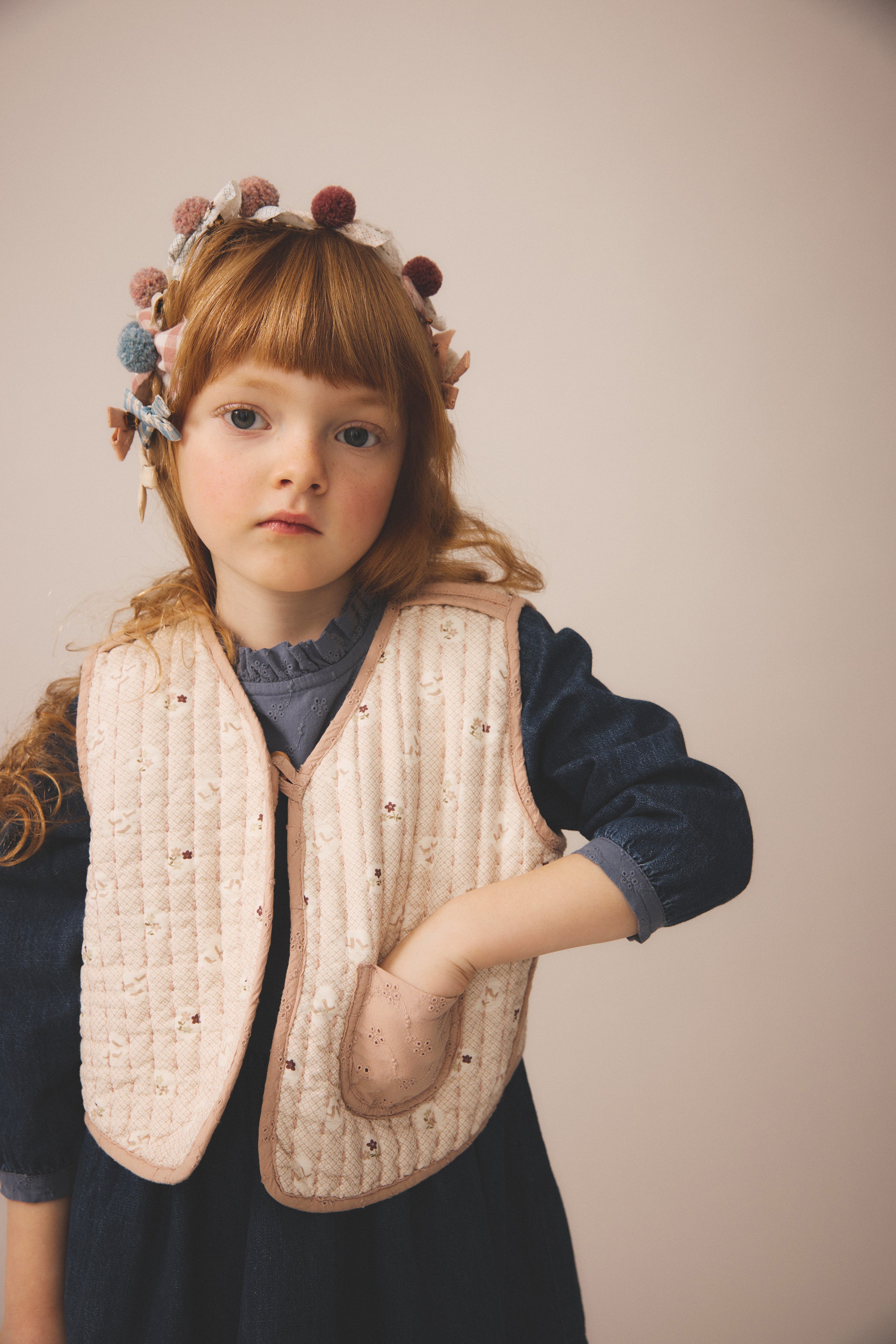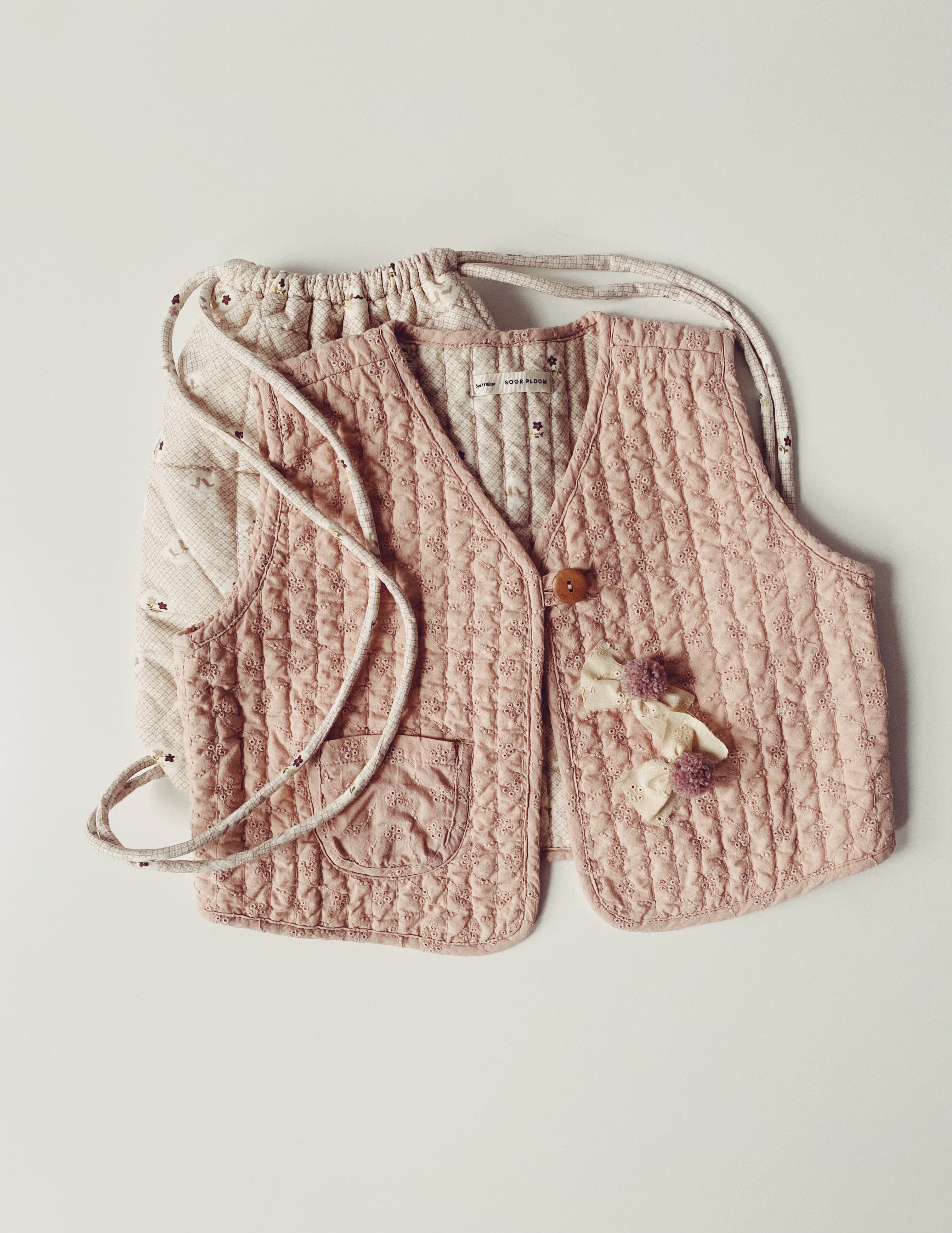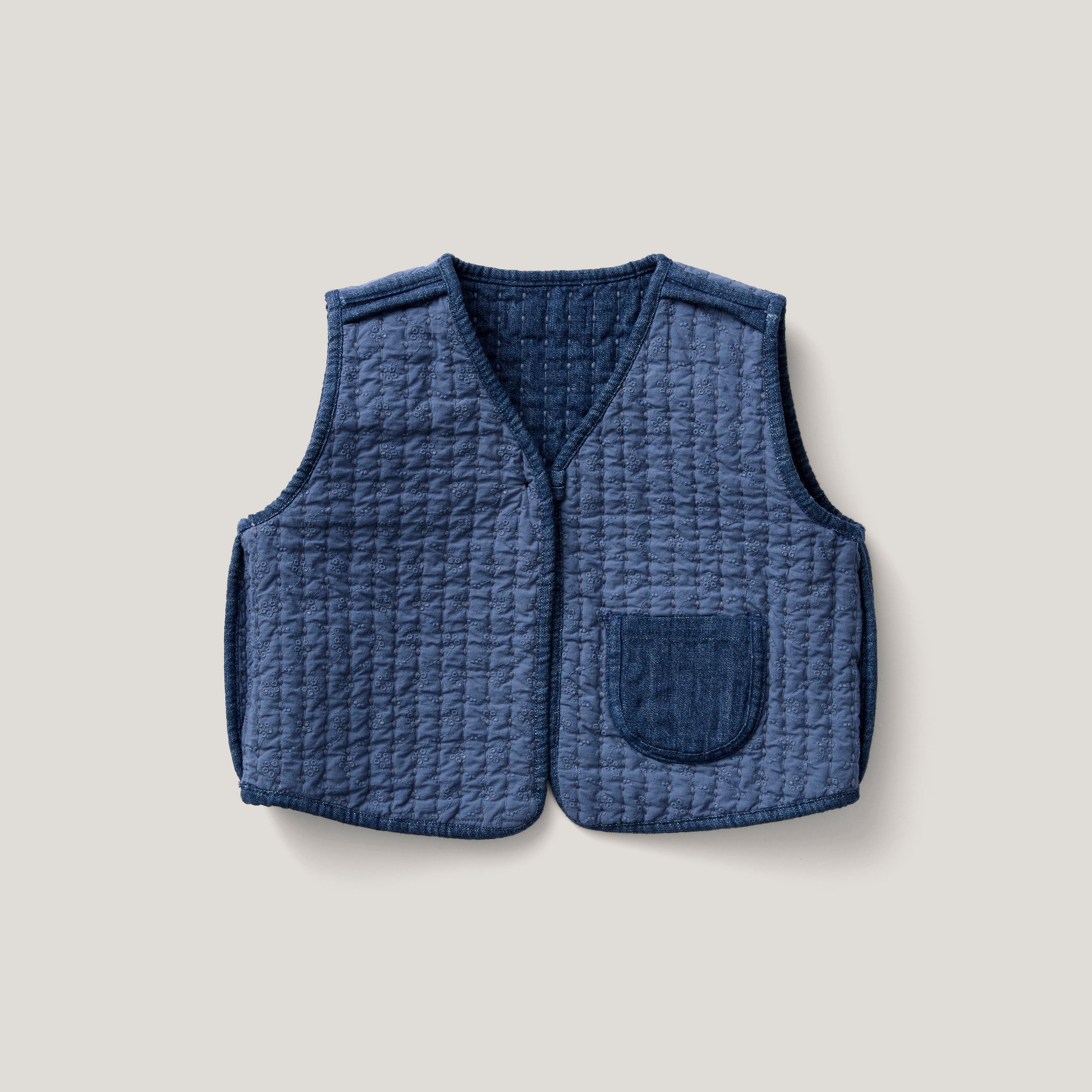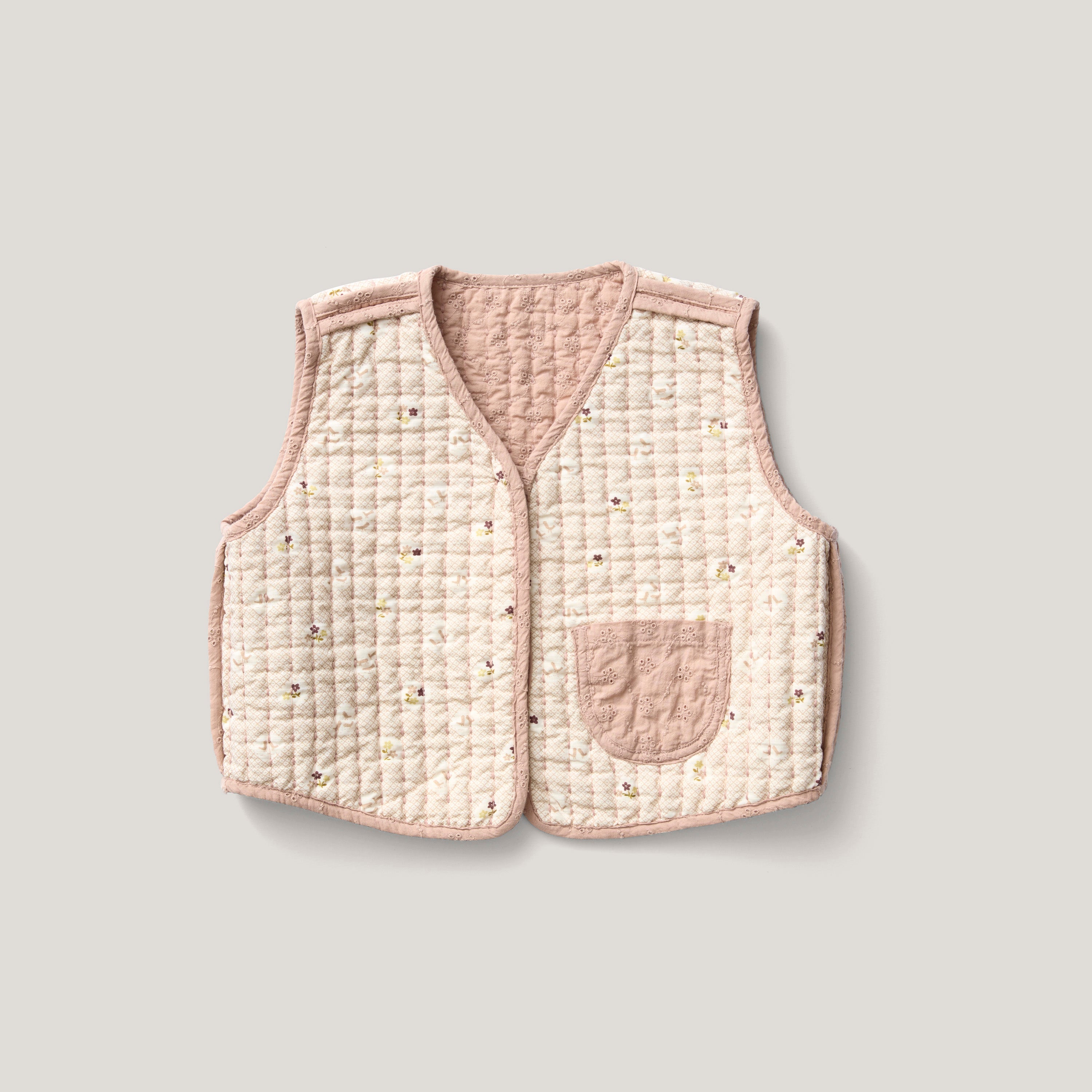 Reversible, quilted vest in eyelet fabric combo with tonal stitching and reverse binding.