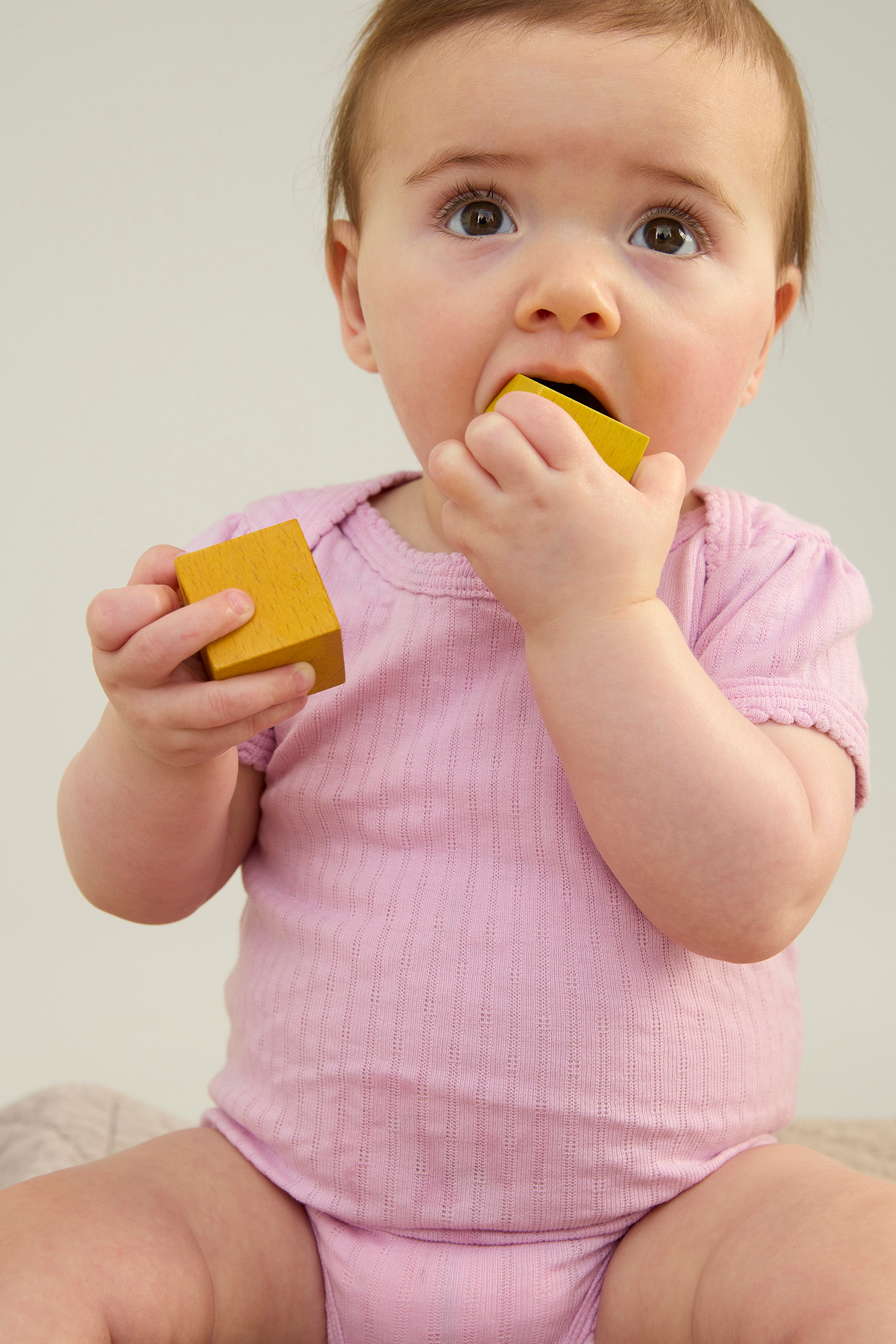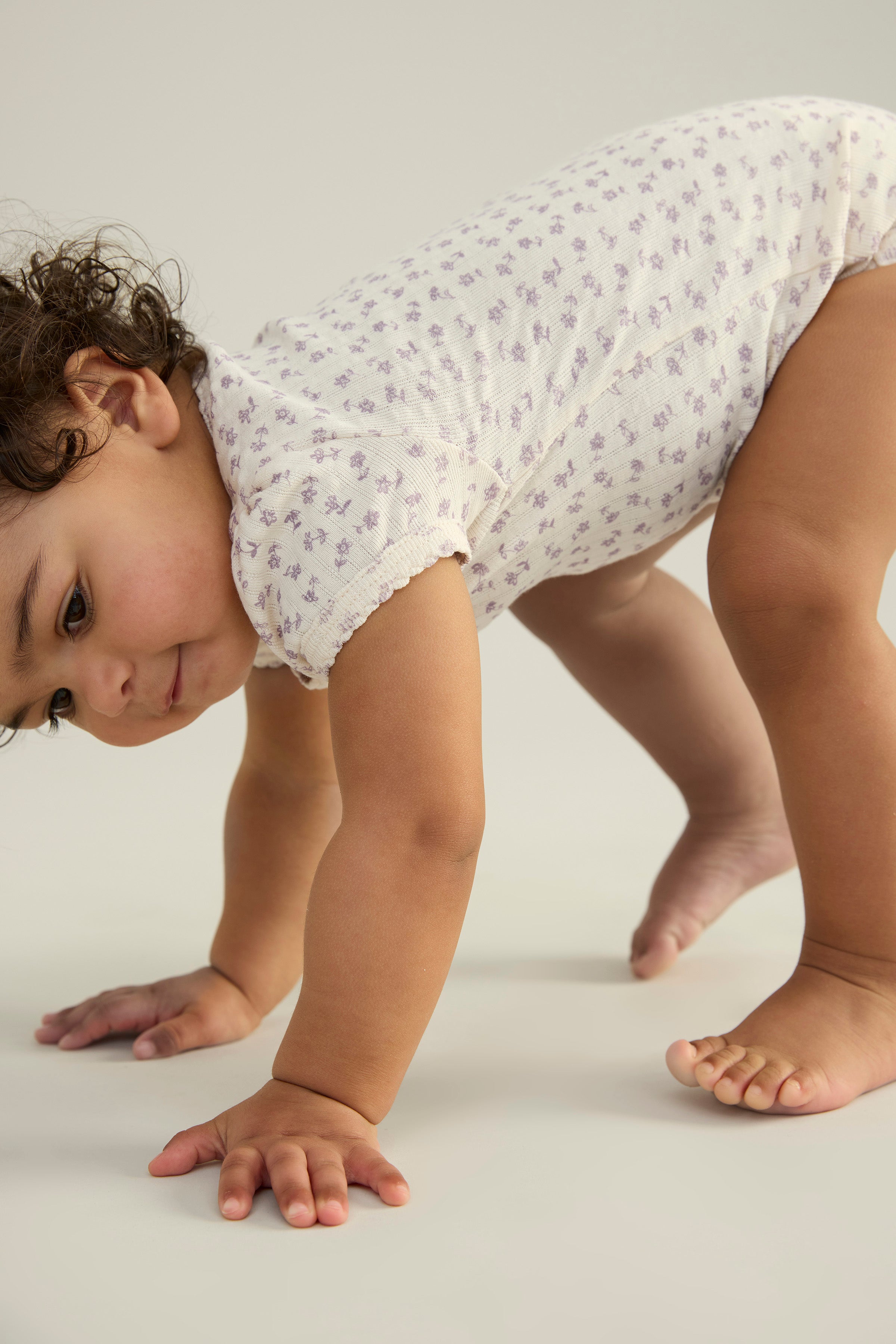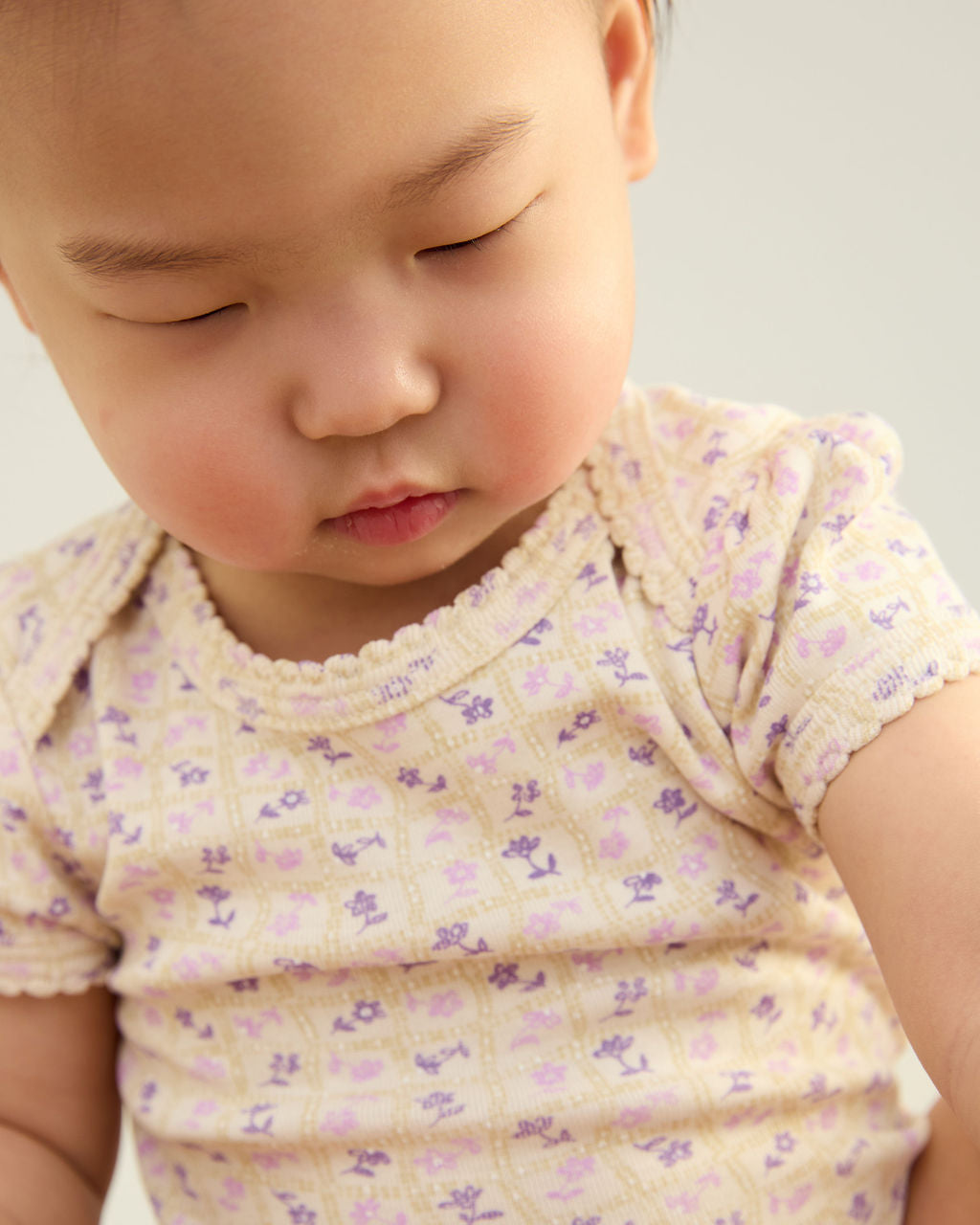 Our short pouf sleeve onesie for baby in softest organic pima cotton. Scallop stitch at neck, armhole, and leg opening. Snaps at crotch.