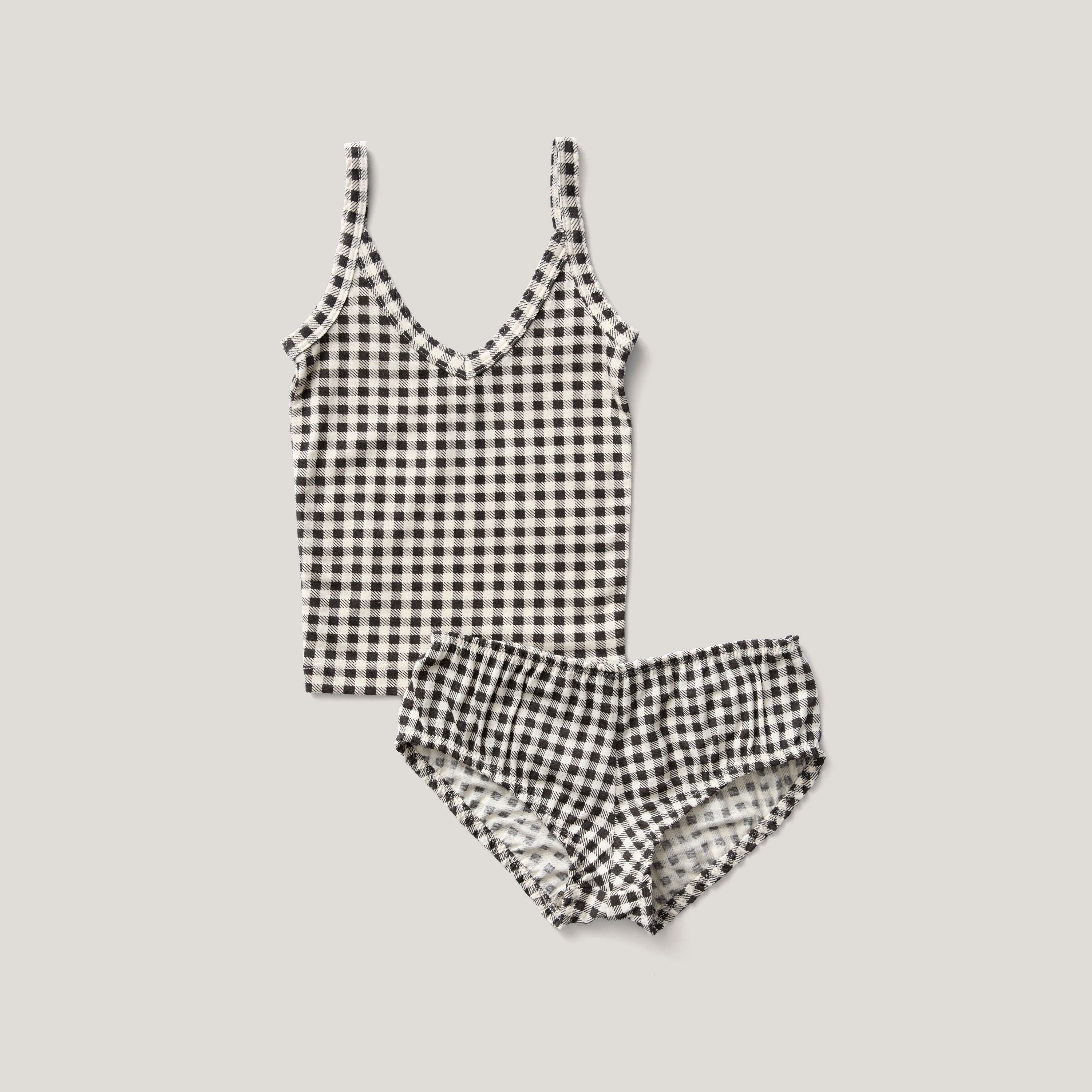 Cropped v-neck camisole paired with our hipster panty for older girls in soft and stretchy pima cotton and modal blend. Scallop stitch detail at neck, straps, waist, and leg.