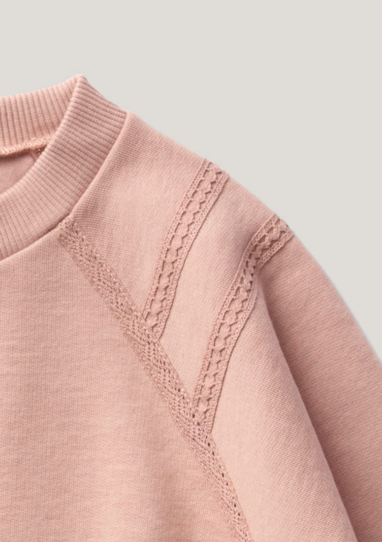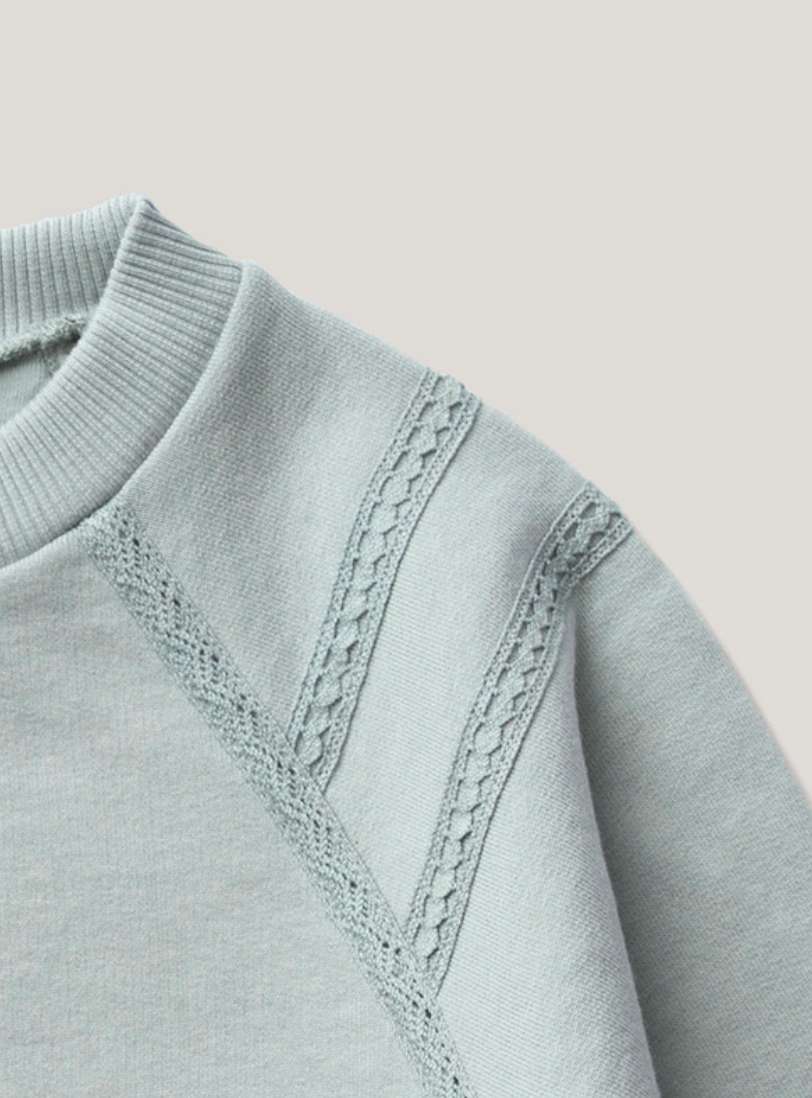 Crochet appliqué detail at shoulder, sleeve and bottom finished with rib.